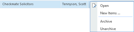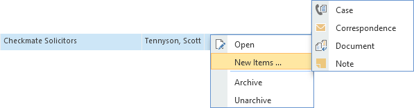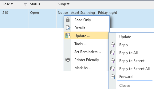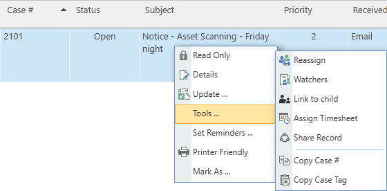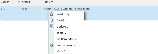The following right-click menu is displayed when right-clicking on a Record (Case, Problem, or RFC) in the main window. As well as when right-clicking on a Case in the Cases tab of a Contact or Organisation.