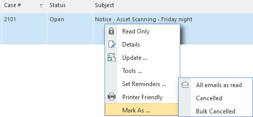 | Mark As ... | Presents the Mark As sub menu where Records can be cancelled or email updates marked as 'Read' |