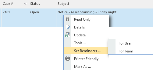 | Set Reminders ... | Presents the Set Reminders sub menu where reminders can be configured for a Team or User. |