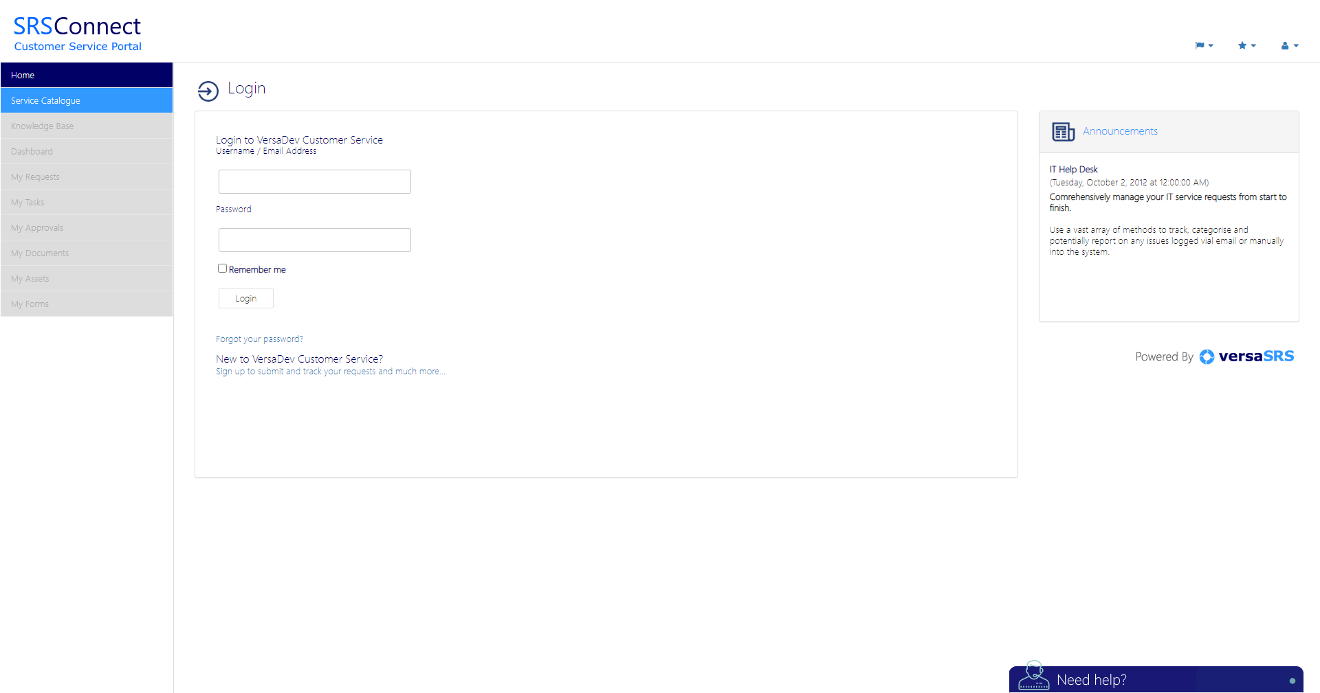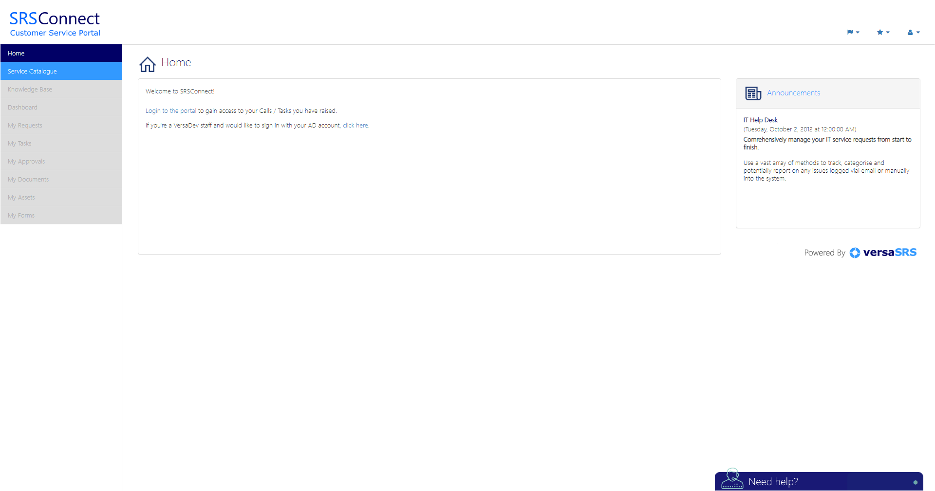 SRSConnect is accessed via a web browser. The URL associated with SRSConnect is set up during the installation phase of versaSRS. Before the SRSConnect user can access all the features the user will need to have an account. Until the account has been created there will be limited access with only certain tabs being visible: Home, Knowledge Base, and the Service Catalogue tab.