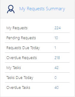 The My Requests Summary shows a quick overview of the number of requests, pending requests, requests due today, overdue requests, number of tasks, tasks due today and overdue tasks.