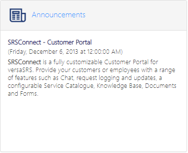If the feature is enabled, there is the ability to display Announcement items that feed from the versaSRS Hot News. This allows News items to be published for the customer to view as well as versaSRS Users.