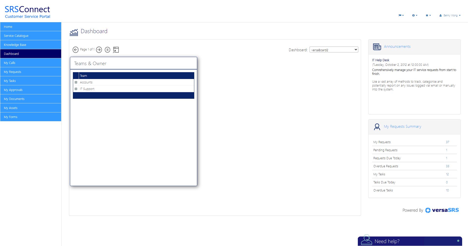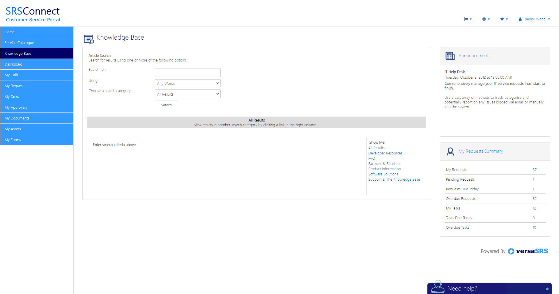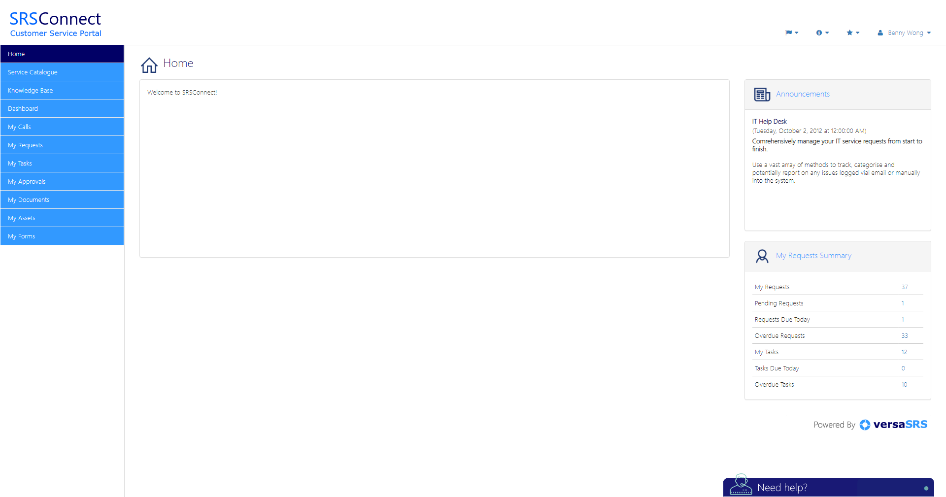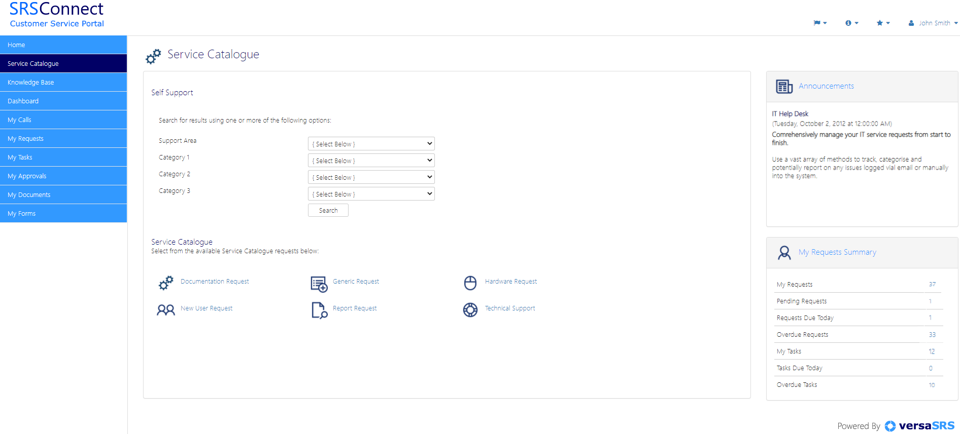 SRSConnect is the customer-access tool for versaSRS. SRSConnect offers a rich user interface that provides your customers with a means to view their requests. This enables customers to raise new requests, update current requests and manage the tasks assigned to them. Other features include the ability to search your Knowledge Base, log requests through the Service Catalogue, view and update Approvals and more. The SRSConnect platform has been intuitively designed to guide workflow and seamlessly integrate with versaSRS.