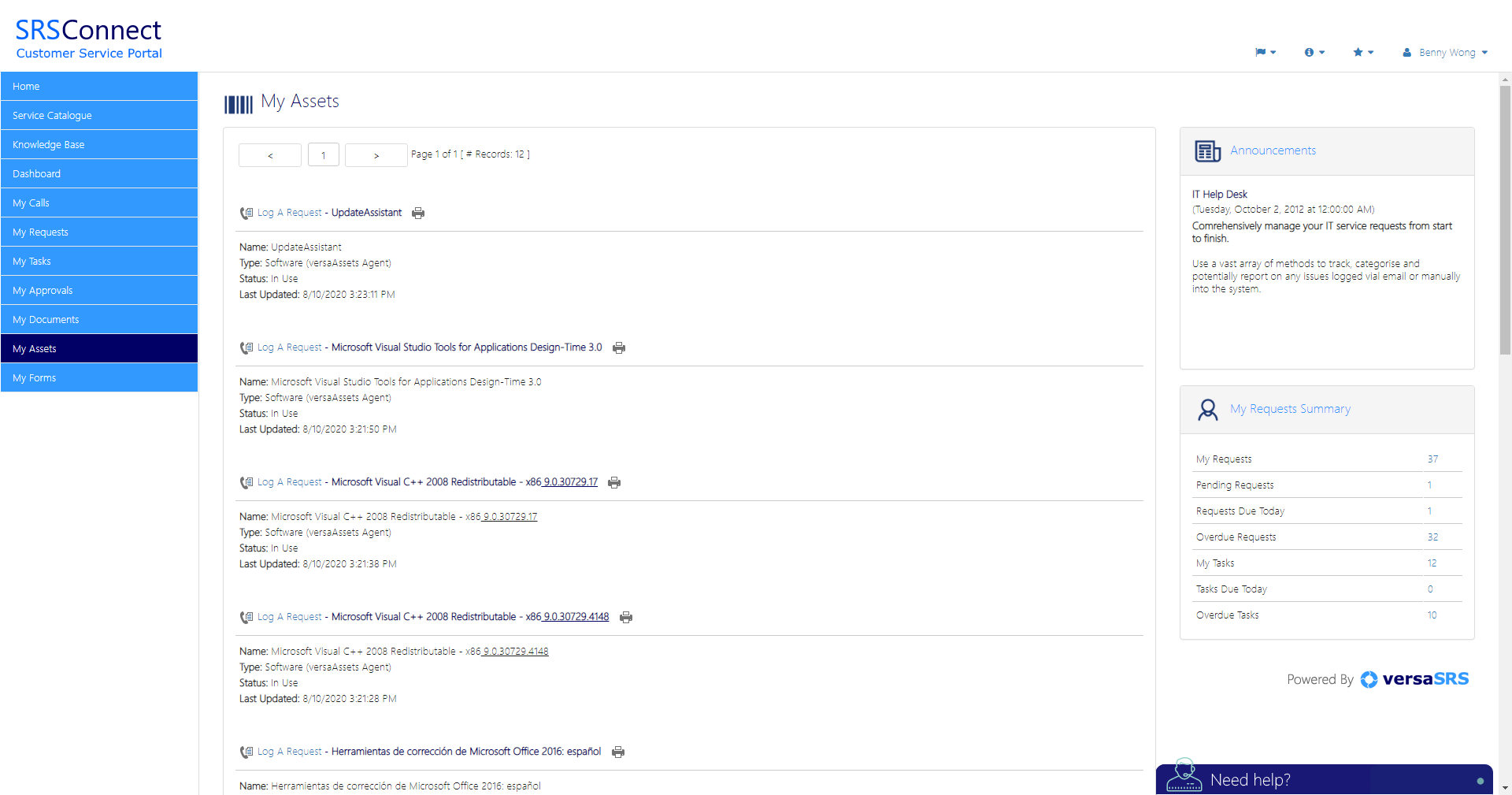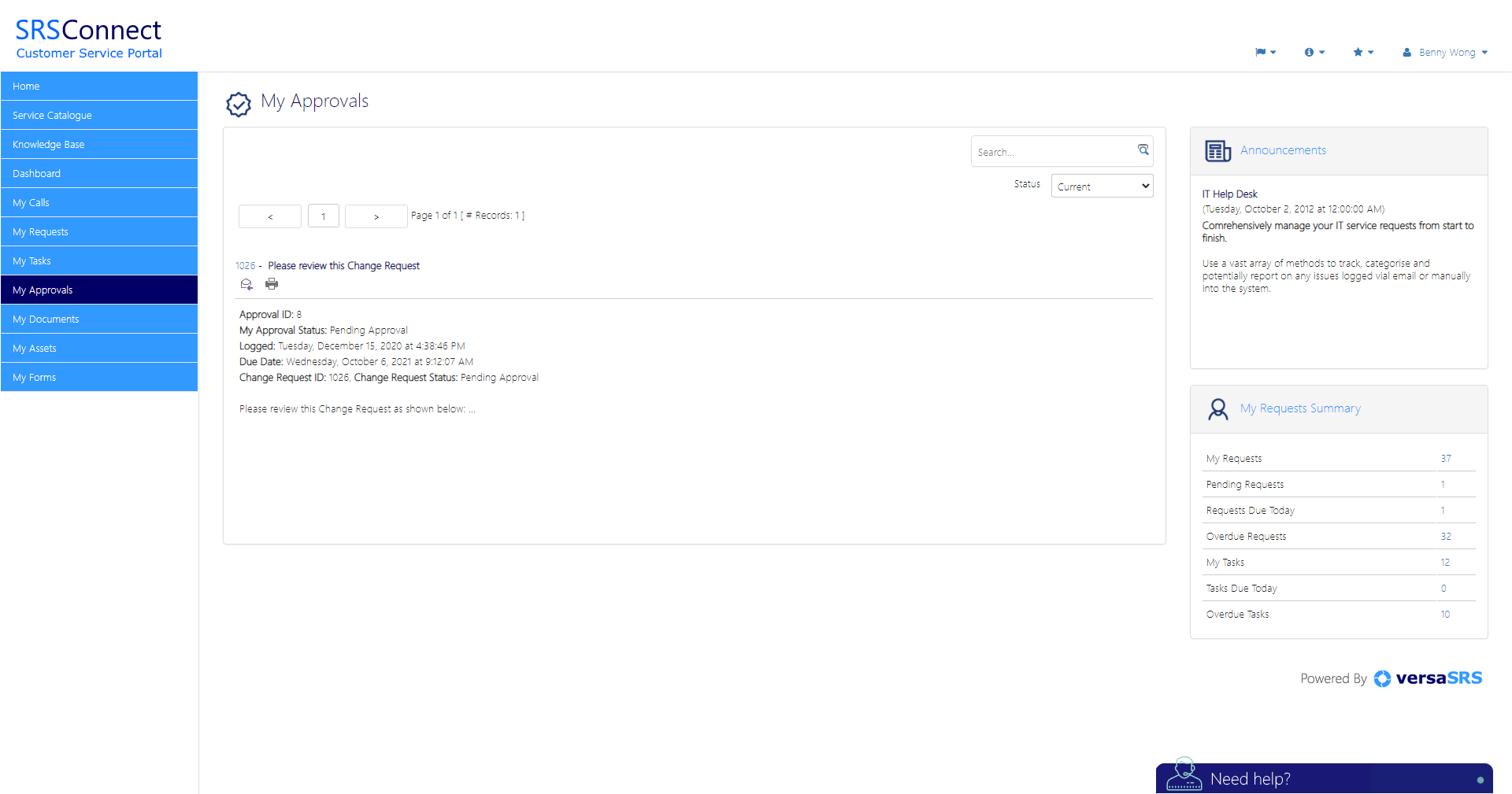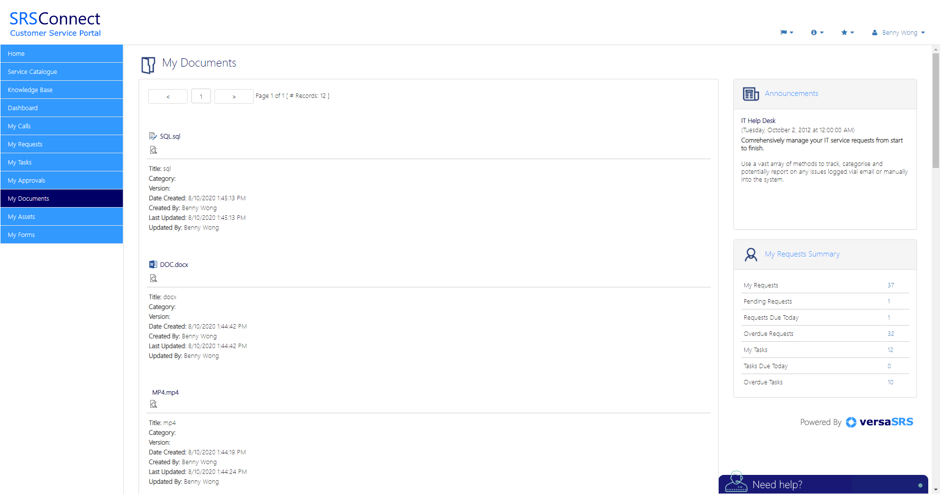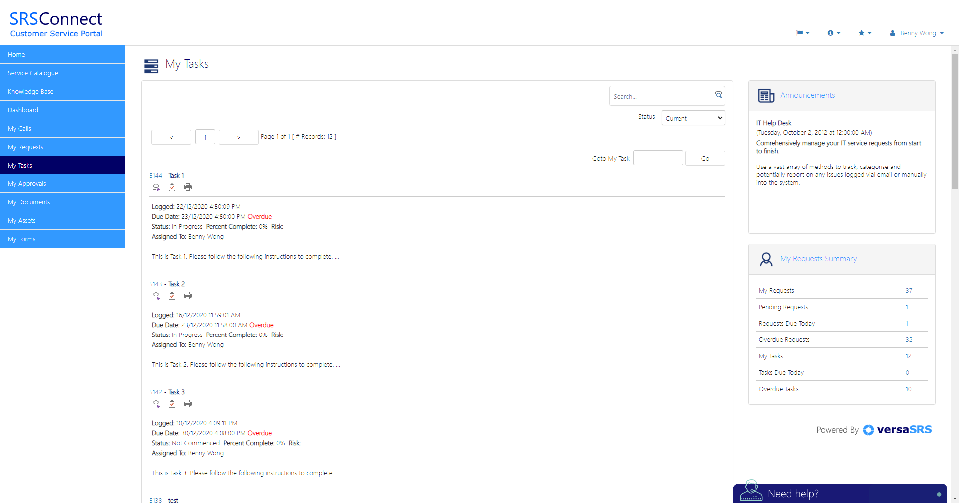 SRSConnect is the customer-access tool for versaSRS. SRSConnect offers a rich user interface that provides your customers with a means to view their requests. This enables customers to raise new requests, update current requests and manage the tasks assigned to them. Other features include the ability to search your Knowledge Base, log requests through the Service Catalogue, view and update Approvals and more. The SRSConnect platform has been intuitively designed to guide workflow and seamlessly integrate with versaSRS.
