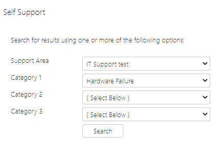 The Self Support section allows an end user to search for Knowledge Base articles based on the below selection criteria: