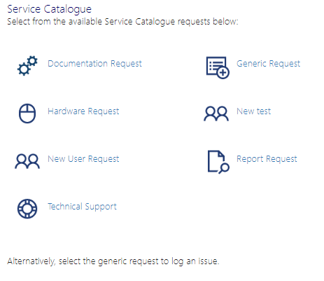 The Service Catalogue tab can be used to create a guide for workflow by allowing customers to log requests based on Service Catalogue items that are made available to them.