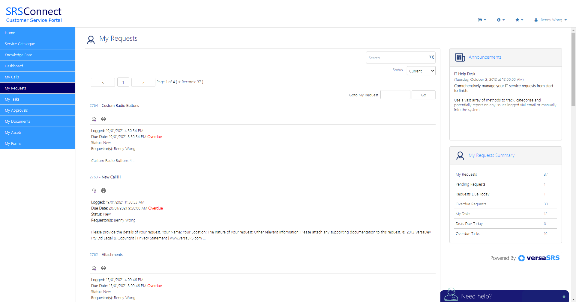 The My Requests tab gives your customers access to the Cases that they have logged as the Primary or Secondary requestors in versaSRS.