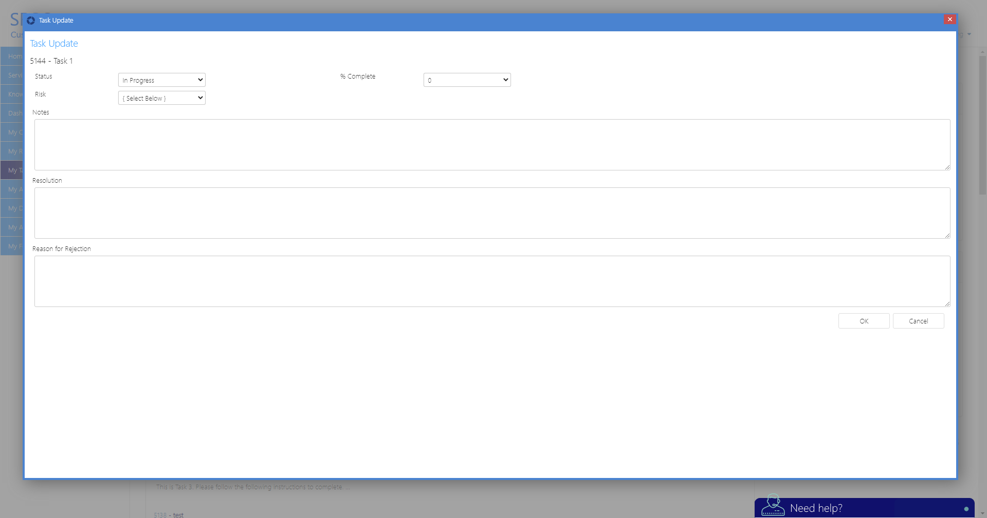 ) under the Case subject, a Task update screen will be presented where customers or external users that have been assigned a Task can update the Status, Risk, and Percentage Complete for the Task. There is also functionality to make Notes, write a Resolution and Reason for Rejection.