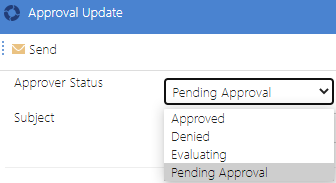 ) in the Tools column. When clicked the Update screen will be presented where the user can set the Approver Status (i.e. Approved, Denied, etc.) as well as provide feedback.