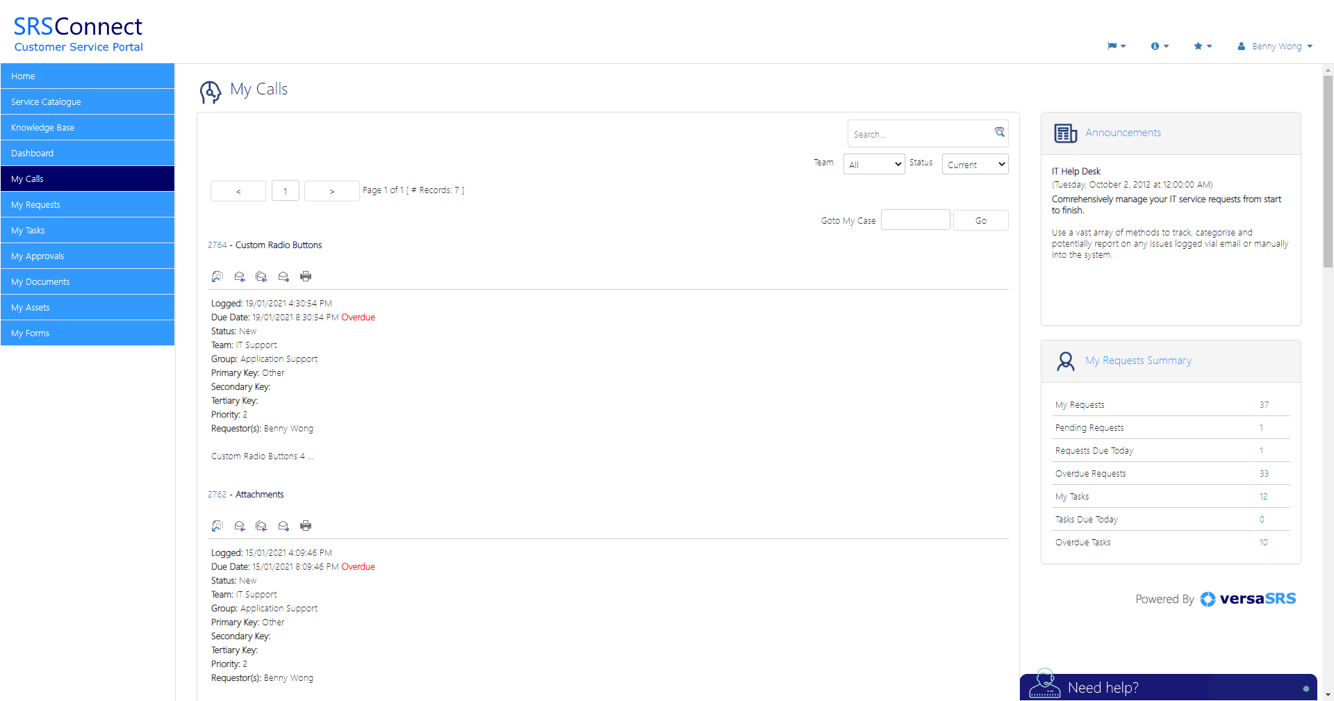 The My Calls tab gives your customers access to the Cases that they have been assigned in versaSRS.