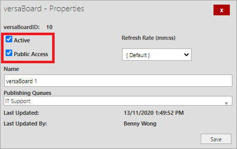 Note: In the versaBoard settings, the Active and Public Access checkboxes must be checked to allow the board to be viewed by SRSConnect users. It must also be published to the Team set for the SRSConnect Settings Application Property AllowedQueues.