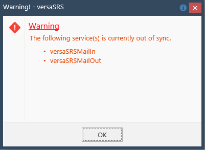 The alerts displayed in versaSRS are not always indicative of an ongoing problem. If the window disappears and no email is received then the Service was momentarily out of sync, likely due to a large email being processed. If an email was received, this is still not indicative of an active issue.