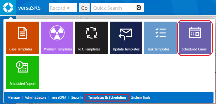 Scheduled Cases can be managed by selecting the Scheduled Cases icon from the versaSpinner - Templates & Scheduling tab.