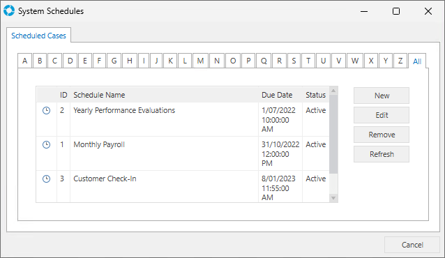 This will display the System Schedules screen where Scheduled Cases can be created and edited.