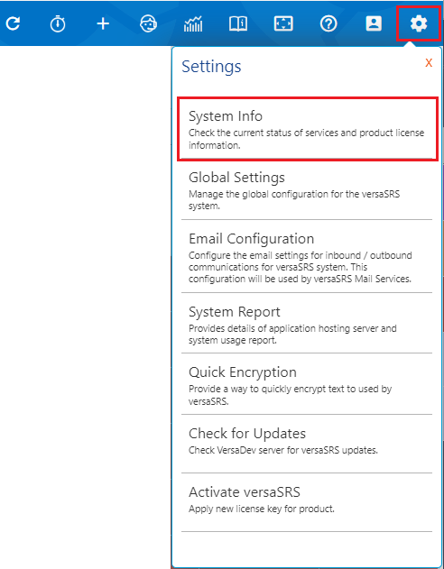 The System Information window contains the current License Details, and versaSRS and versaCRM Mail Service information. To access the System Information select the Settings Icon in the Navigation Header.