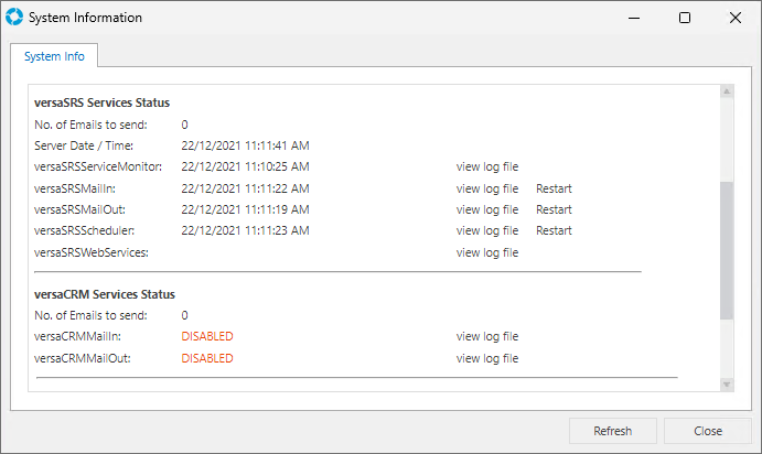 Within the System Information screen is also the ability to restart Mail Services and view the Services Log files.