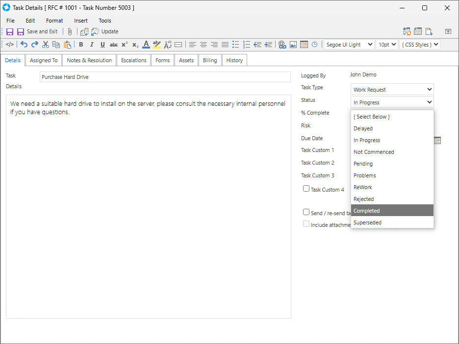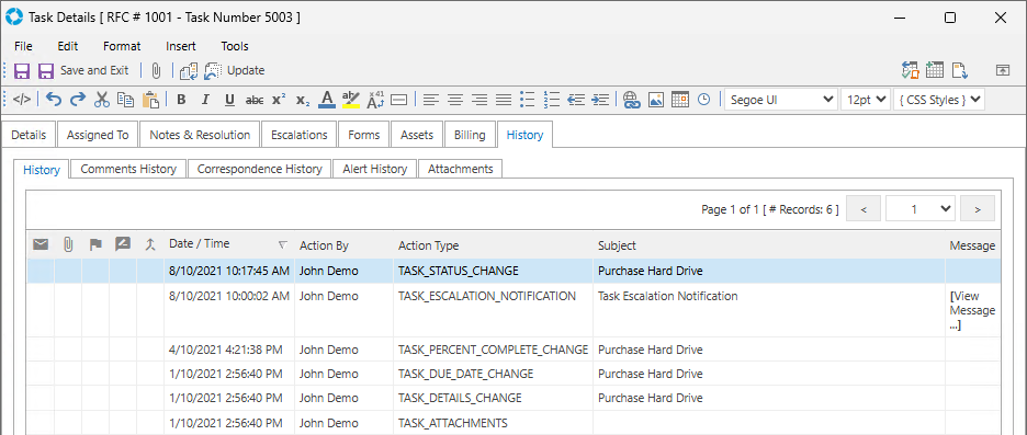 Once the Status of a Task has been changed it will show in the Task Audit History