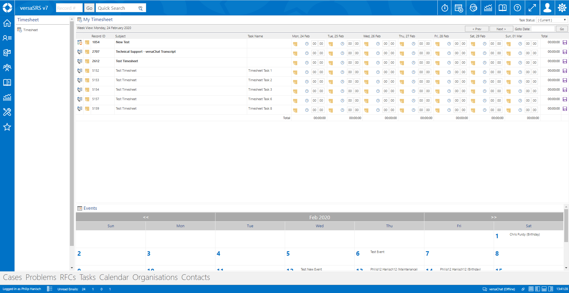 Timesheets have been integrated into versaSRS to allow Users to enter their times against a Record (Cases, Problems, RFC's or Tasks).