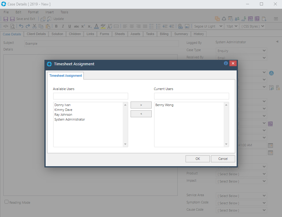 ) within a Case and add the required Users. If a User is added to a Case where they have Tasks assigned to them, the Tasks will also have Timesheets created.
