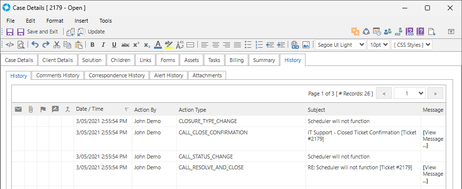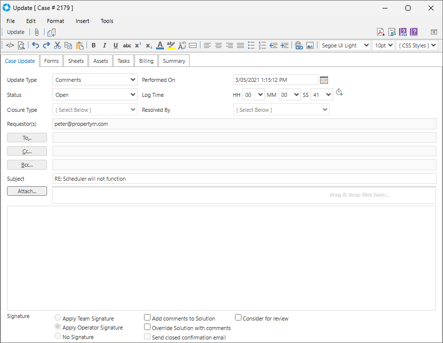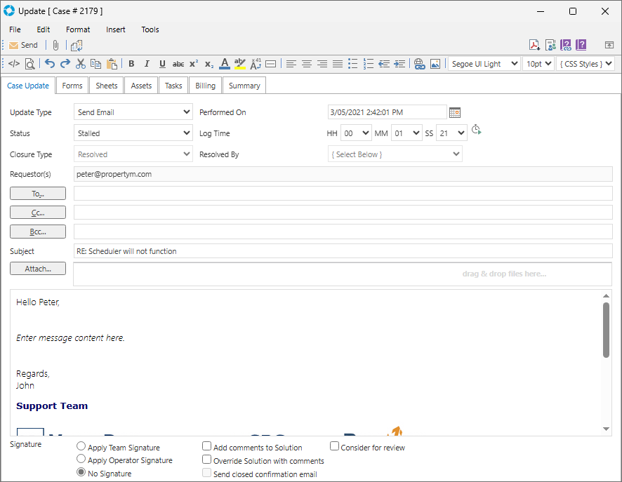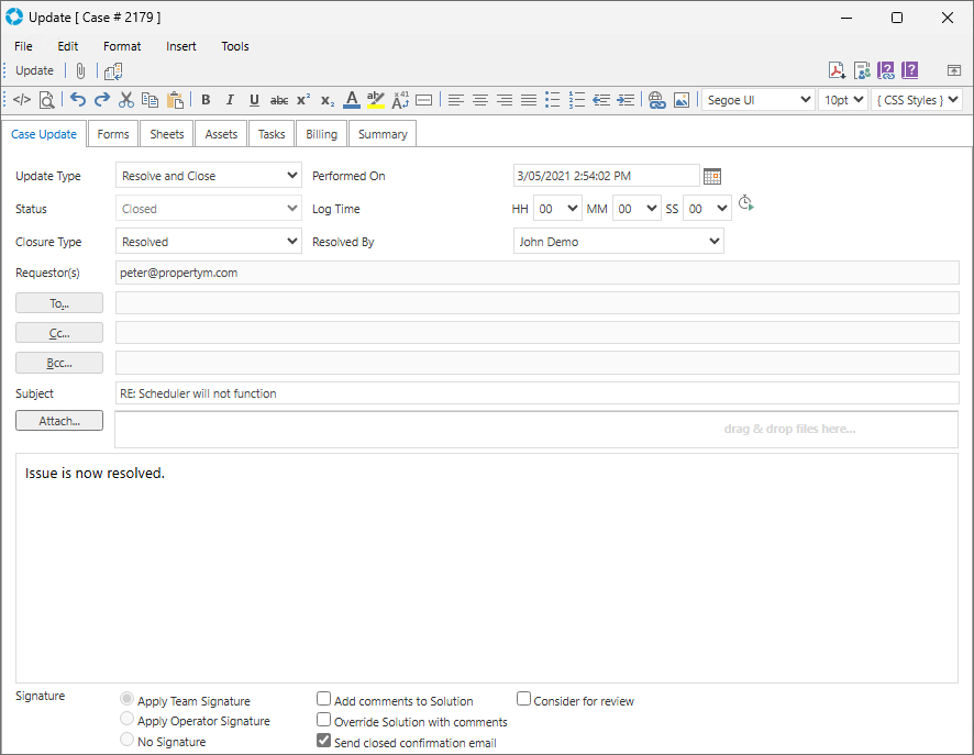 | Resolve and Close | The default behaviour of this Update Type is controlled by the Global Settings Application Property EmailResolveAndClose |