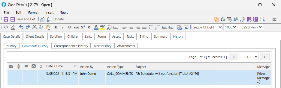 Once a Comment has been applied to a Record it will be available in the History.