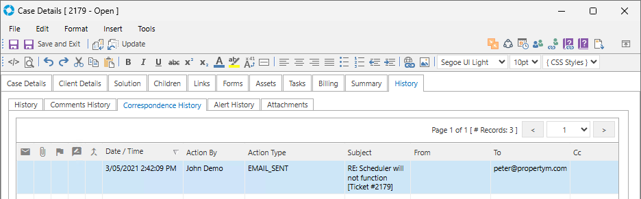 Once an email has been sent from a Record it will appear in the History.