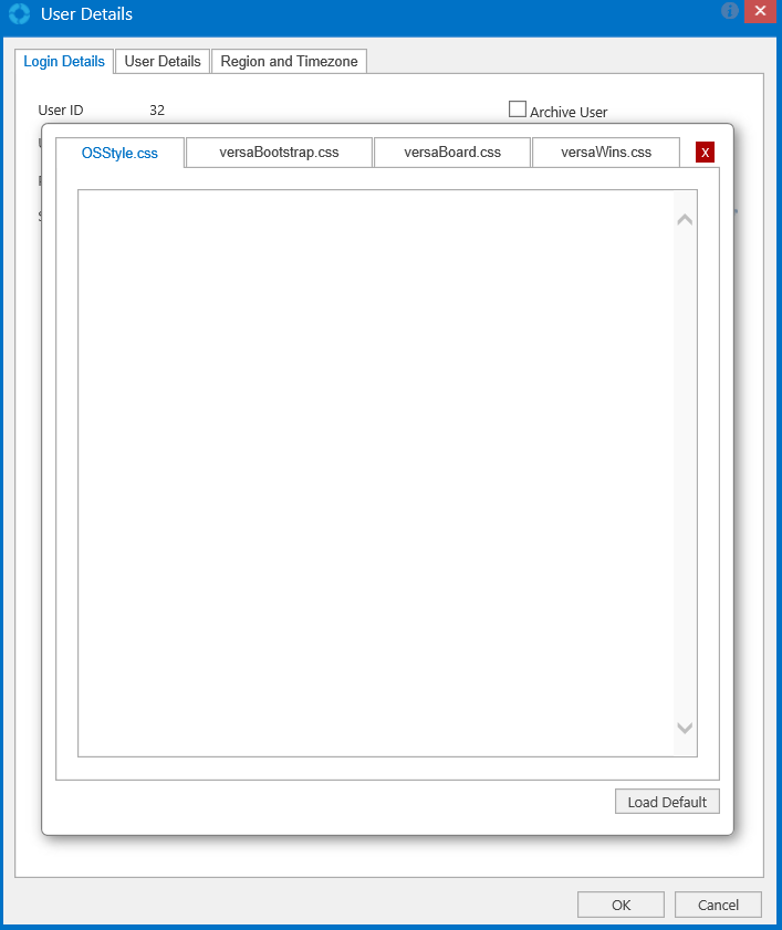 ) will appear next to the User Theme drop-down box. Clicking this will open the CSS script editor where the Custom style sheets can be defined that will override the default style for that element. If there is nothing input here versaSRS will be displayed the same as the Default theme.