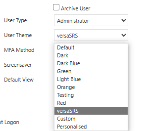 The User Theme allows a User to set a custom theme within their User Profile. They can choose between different colours or specific themes designed for versaSRS that will change the default appearance of the application.