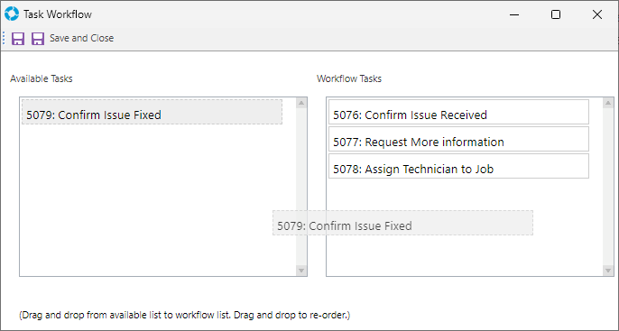 4. Once the required Tasks are added, set the Workflow order for the Tasks by clicking the Workflow button. Drag the required Tasks into the Workflow Tasks box, the Task that appears first in this list will be the first one in the Workflow.