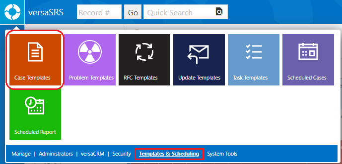 1. Select the versaSRS Spinner icon and under the Templates & Scheduling tab click the Case Templates option.