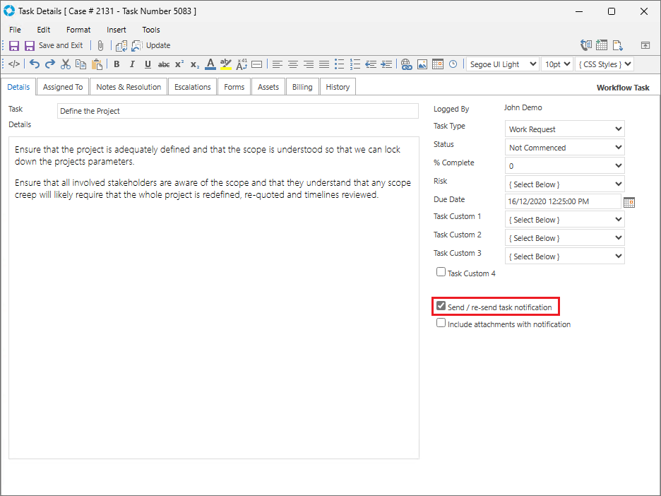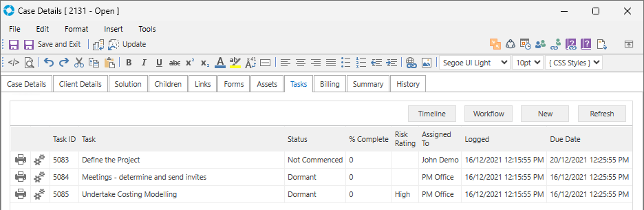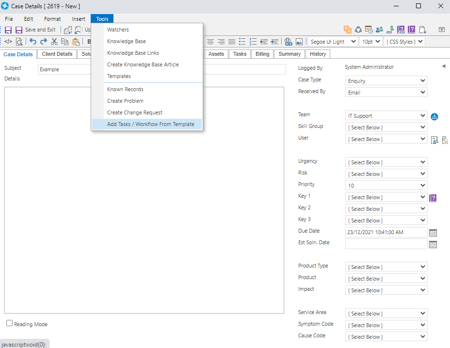 Workflow can be created directly on a Record (Case/Problem/RFC) by adding Tasks in the Tasks tab or a Template can be created with an existing Workflow that can be applied to Records as required. The below instructions are specific to creating Workflow for a Case.