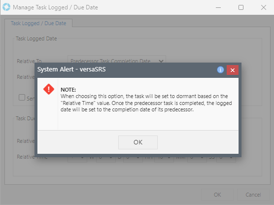 Note: Setting the Task Logged Date to be relative to Predecessor Task Completion Date will cause the Task to go into a dormant state until the predecessor is complete, as advised by the warning message that will be displayed.