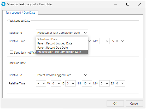 The Task Logged Date can be set relative to Scheduled Date, Parent Record Logged Date, Parent Record Due Date and Predecessor Task Completion Date.