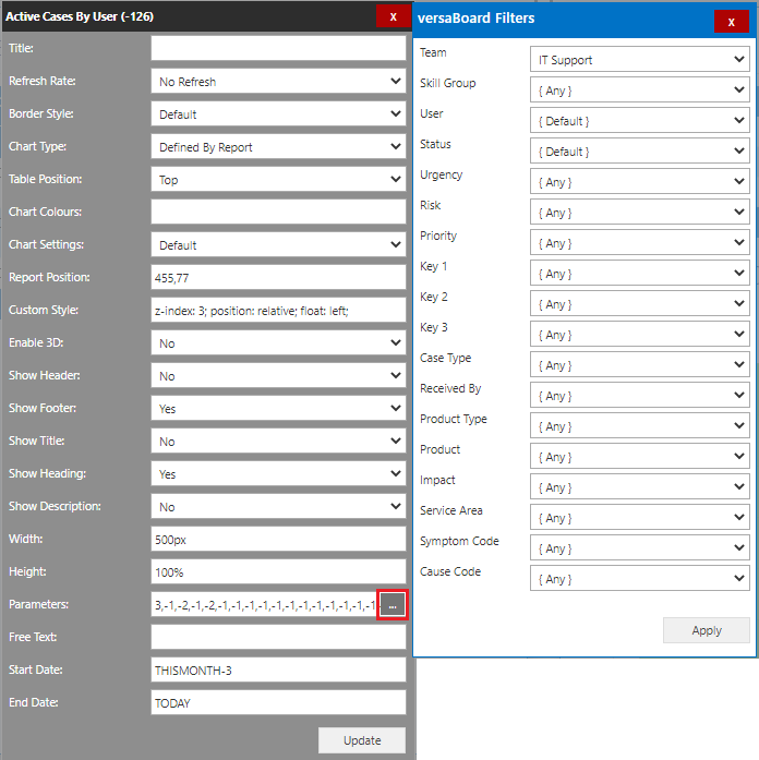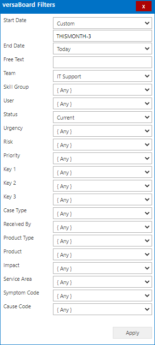 As well as individual Report Parameters there are also Global versaBoard Filters that can be set to apply to all Reports within the versaBoard. This will only apply if the Reports used on the versaBoard utilise the parameters available.
