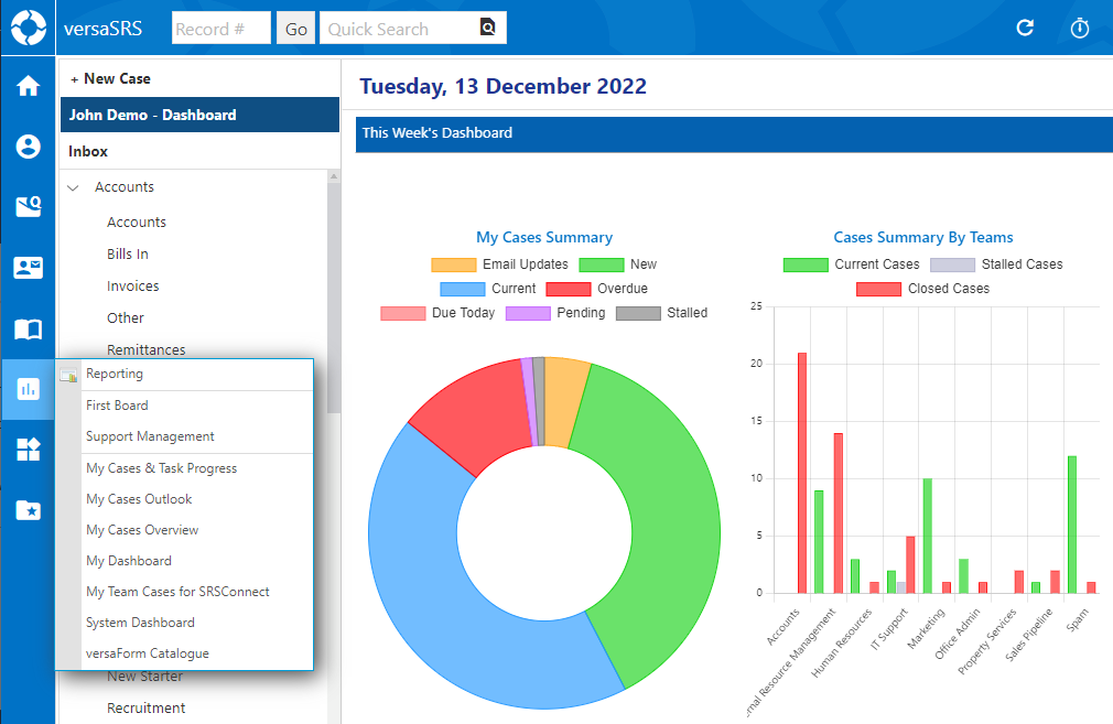 versaBoard is a module in versaSRS that allows Reports from the Reporting Dashboard to be displayed visually with charts and tables in a slide-show format. This can be used to present versaSRS information on a screen in a rich graphic format that is populated at set time intervals as well as able to be triggered manually, allowing for dynamic viewing and live updates of Report data.