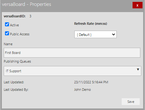 In order for the versaBoard to be visible to specific versaSRS Users you must ensure the board has the Active checkbox ticked, and the necessary Team(s) selected in the Publishing Queues.