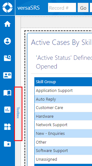 When Designer Mode is active the Toolbox becomes available as a slideout on the left side of the panel, expanding this will show the available Reports that can be added to the versaBoard.
