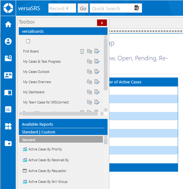 To launch a versaBoard in versaSRS select the Reports icon on the Navigation Sidebar then select the desired versaBoard from the available list.