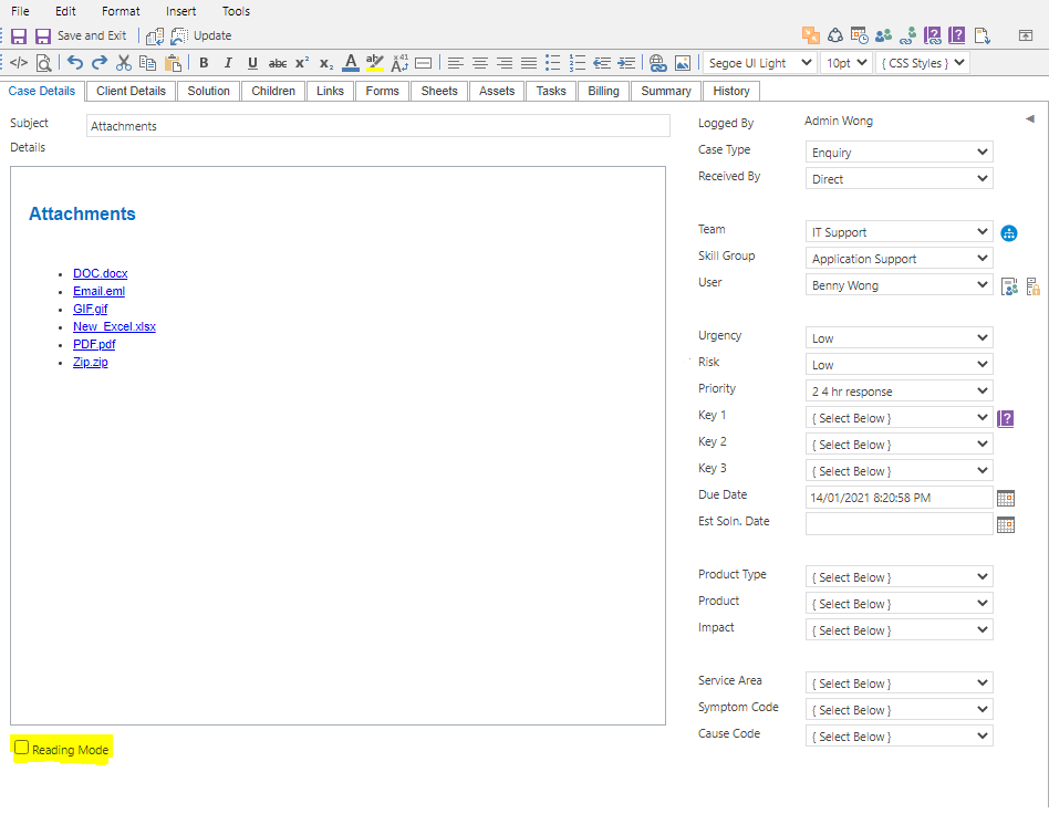 Note: The Reading Mode checkbox at the bottom of Case details needs to be checked in order to download the attachments. They can also be downloaded via the Attachments tab within the History tab.