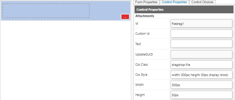 Note: The Class "dragdrop-file" will be automatically input in the Css Class field in the Control Properties tab. The size of the Attachments Control can be edited by specifying a value in the Css Style field.