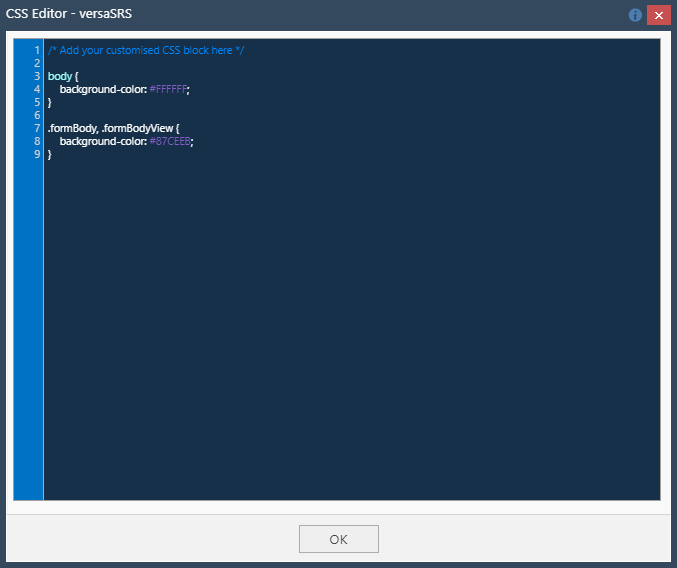 Double clicking the Text area in Control Properties will populate a CSS Editor screen. The below is the example of the CSS Style to change the background colour and the Form background colour.