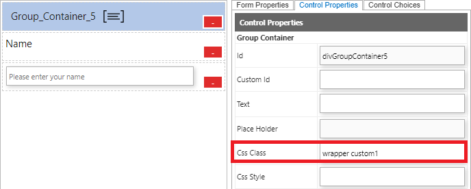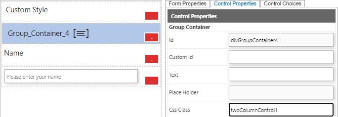 Drag and Drop a Group Control onto the Form. Enter the Css Class defined in step 1. Using "twoColumnControl1" as this example. The defined CSS Style for the Group Container will apply to all of the Controls under the Group.