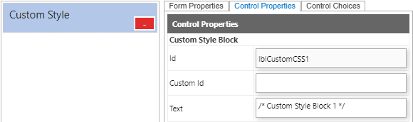 Adding Custom CSS Styles in the Form in order to easily target specific Form fields, or apply the same styles to multiple fields. The Custom Style Control can be dragged and dropped onto the Form.