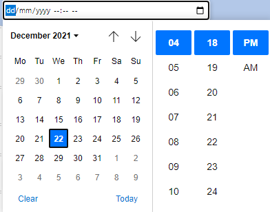 The Date / Time control creates an input field that allows the user to select a date and time, either with a textbox that validates the input or a special date picker interface. The Date and Time format are DD/MM/YYYY HH:MM AM/PM.