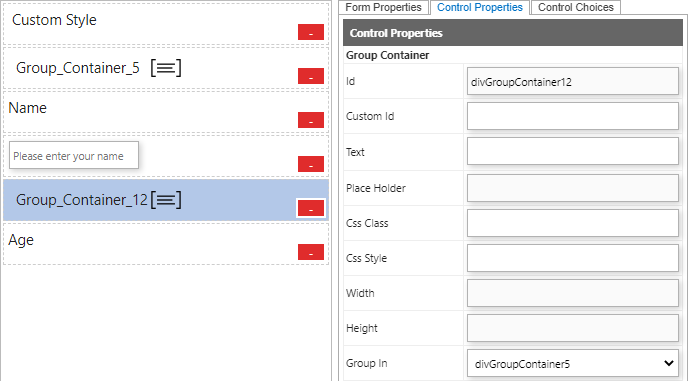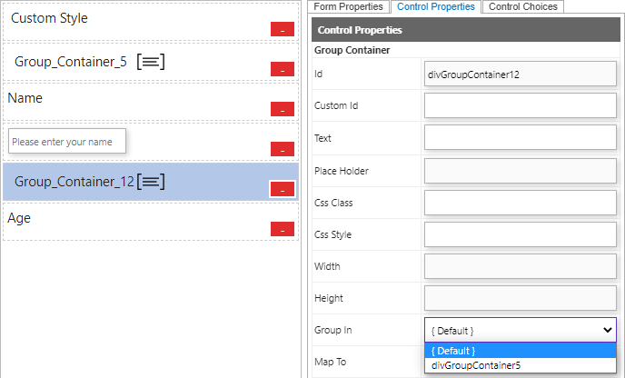 Example 2: The Group_Container12 has divGroupContainer5 selected in Group In field. All Css Classes will apply to the Group_Container_12.