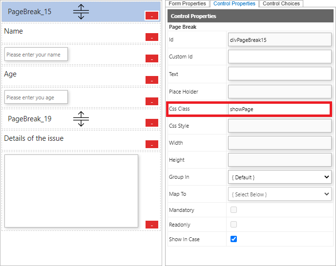 First Page Break: The showPage Css Class in the first Page Break needs to be entered in order to operate.
