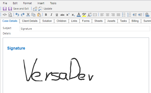 The Signature Control allows the Form to collect a digital signature via the Form. When a Form with a signature is submitted, the signature appears as an image in the Case.