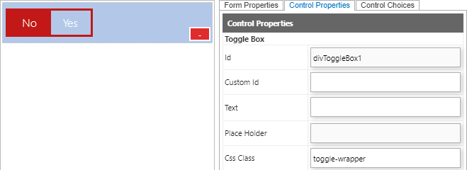 The Switch Toggle allows yes or no selections. Only a single choice can be selected in Switch Toggle. It can be dragged and dropped onto the Form. Please note that the Class "toggle-wrapper" will be automatically be filled in Css Class field in Control Properties.