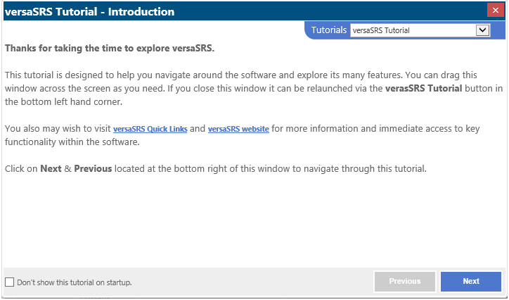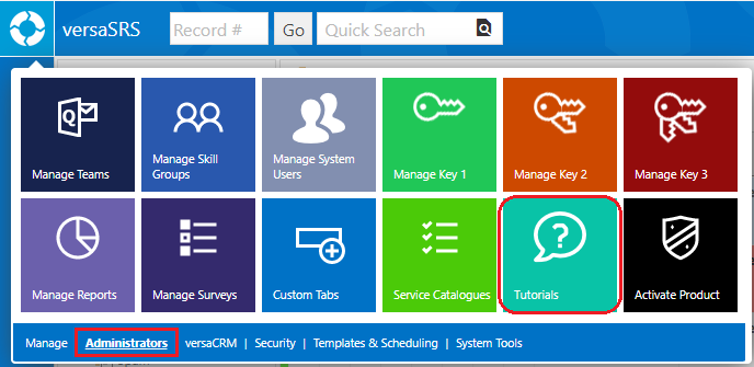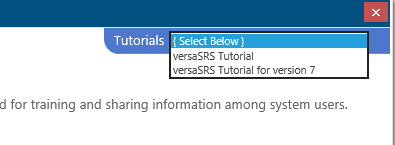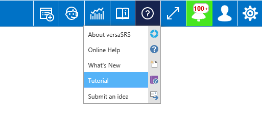 Tutorials in versaSRS provide the ability to create custom guides to assist with training new Users. Tutorials can be accessed directly via the Help icon in the Navigation Header.