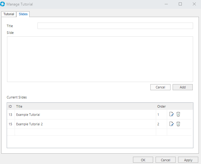The Slides tab allows Slides to be added to the Tutorial. For each slide a Title and the Slide content can be entered into the fields and then added to the Tutorial.